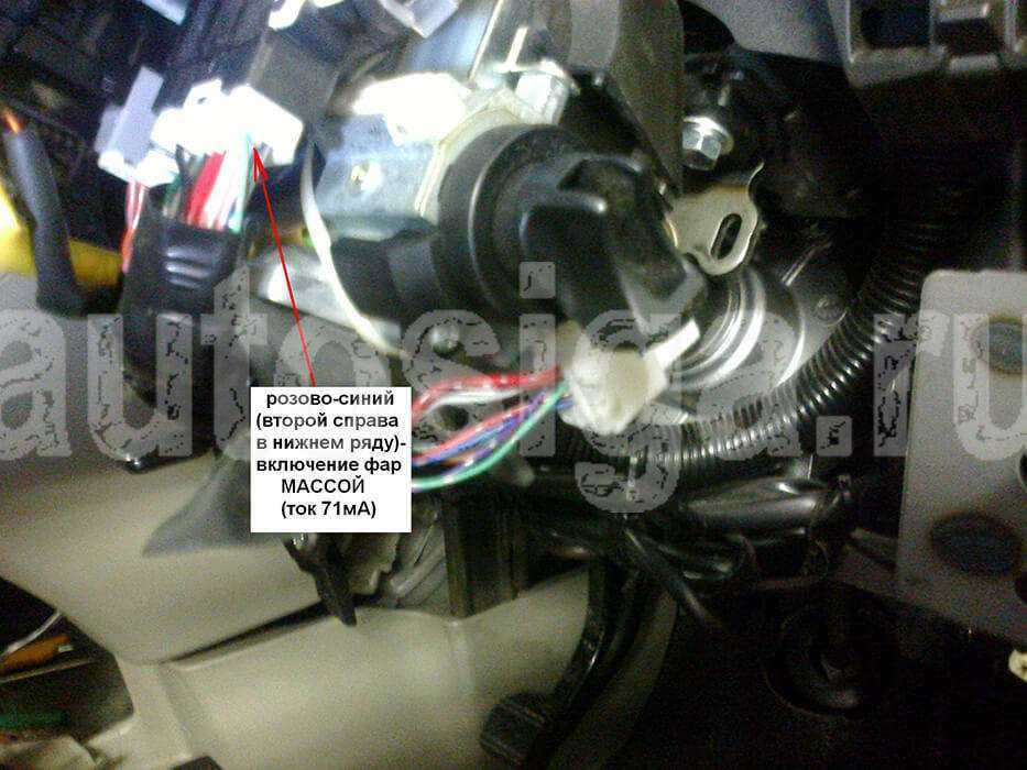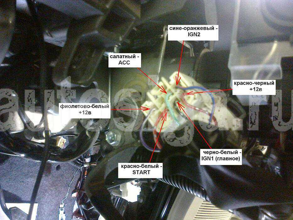 Замок зажигания:+12 – синий/красный, красный/черныйАСС – салатовыйЗажигание 1 – черный/белыйЗажигание 2 – зеленыйСтартер – фиолетовый